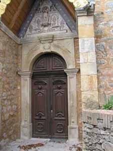 A second cave appears on a bas relief on the altar itself, lovingly hand-painted by Sauniere himself. An image of the Magdalene or what might just as well be young Marie kneeling in a grotto before a grinning skull, the silhouette of what Sauniere claimed was Jerusalem visible on the distant horizon. Time forbids a fuller listing of the décor's oddities and inherent contradictions, which include any number of images of Saint Anthony, a personage known for his temptations both daemonic and sexual. Two of the scariest cherubs imaginable adorn the wooden doors above which appears the maxim: