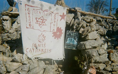 The Bethlehem Grotto is so-named because of a natural shaft in the rock, that causes a beam of light to fall on the ancient stone altar before the pentagram on just one day of the year - the 25th December. Members of Gadal's neo-cathar Rosicrucian movement undergo a three-year period of study, meditation, indoctrination, fasting and general reprogramming before undergoing their final initiation in the pentagram, possibly in the presence of the 'Pyrenean Grail', which, I believe, may be in the movements hands. Since the making of The Secret Glory, the grotto has been haphazardly fenced off by the neo-Cathars, destroying much of the site's natural beauty. Behind locked steel gates excavations continue in secret, yielding a steady trickle of fascinating, often contradictory artefacts.